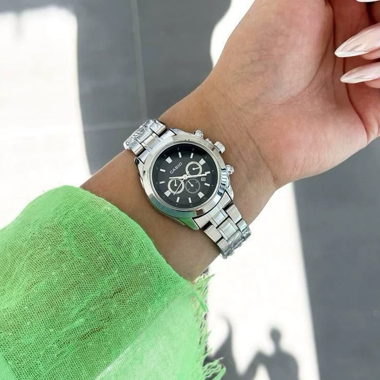 ساعت مچی کاسیو زنانه طرح سه موتوره نقره ای صفحه مشکی