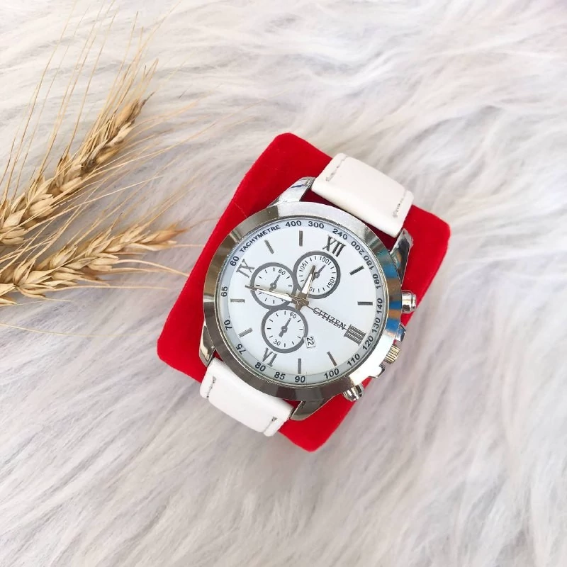 ساعت ست سیتیزن بند چرم سفید قاب نقره ای