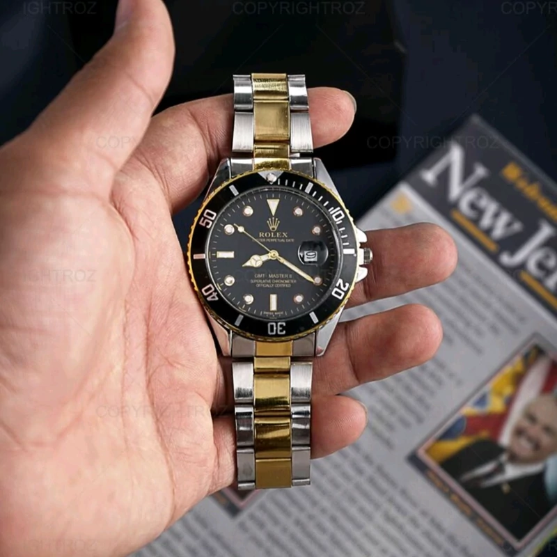 ساعت مچی مردانه مارک رولکس طرح دراگون دارای تقویم کیفیت عالی بنداستیل دورنگ طلایی صفحه مشکی شش ماه گارانتی موتور دارای ج