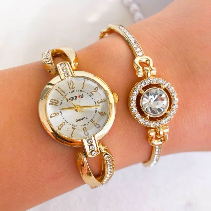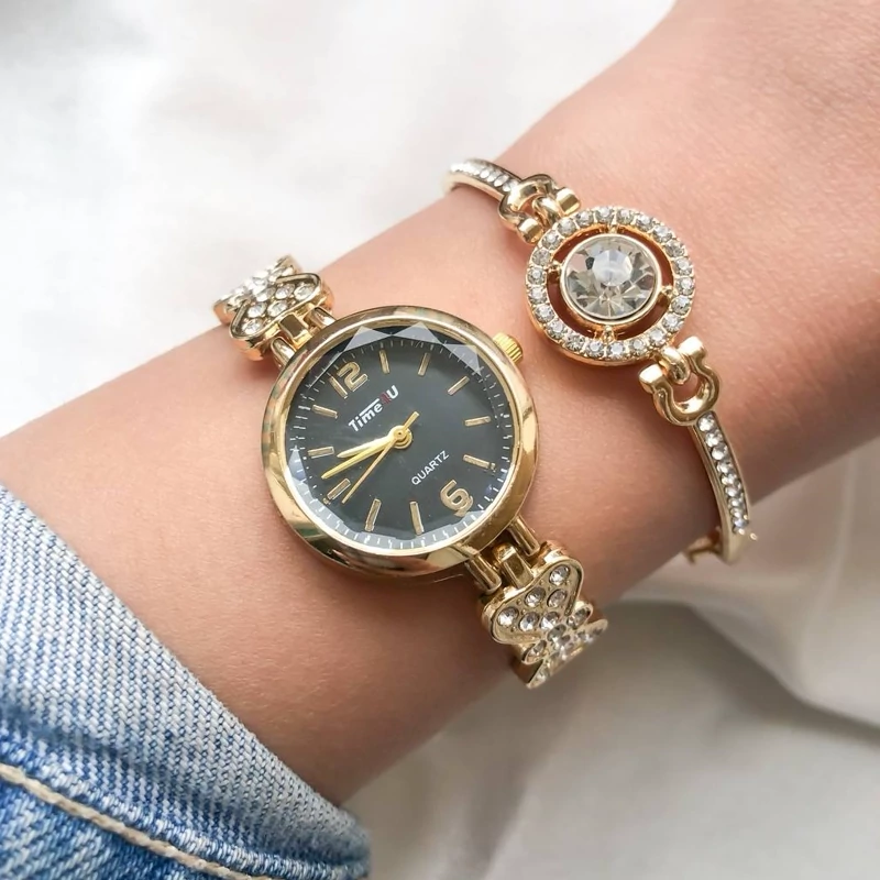 ساعت زنانه نگین دار طلایی بهمراه دستبند