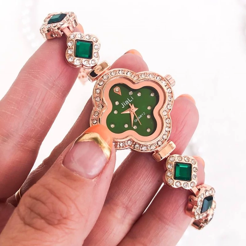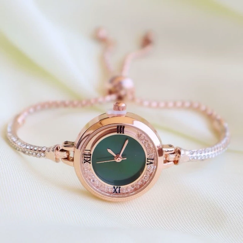ساعت زنانه فانتزی ظریف قطر صفحه 20 میل رزگلد بند نگین سبز و سفید