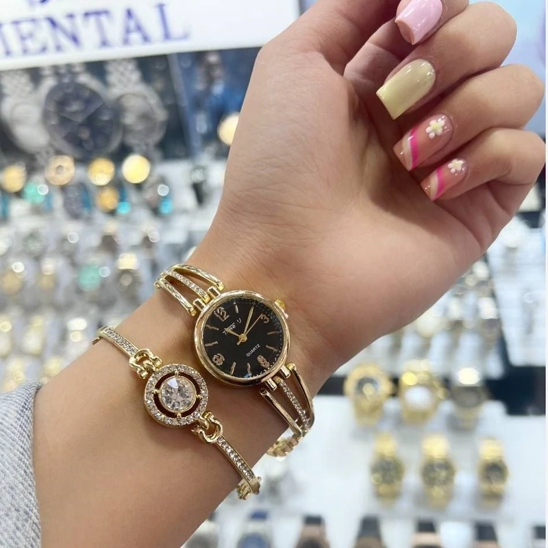 ست ساعت و دستبند زنانه طلایی مجلسی صفحه مشکی