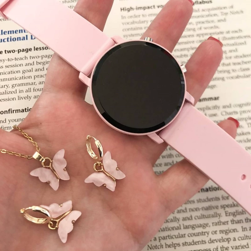 ست ساعت ال ای دی بندژله ای صورتی همراه نیمست