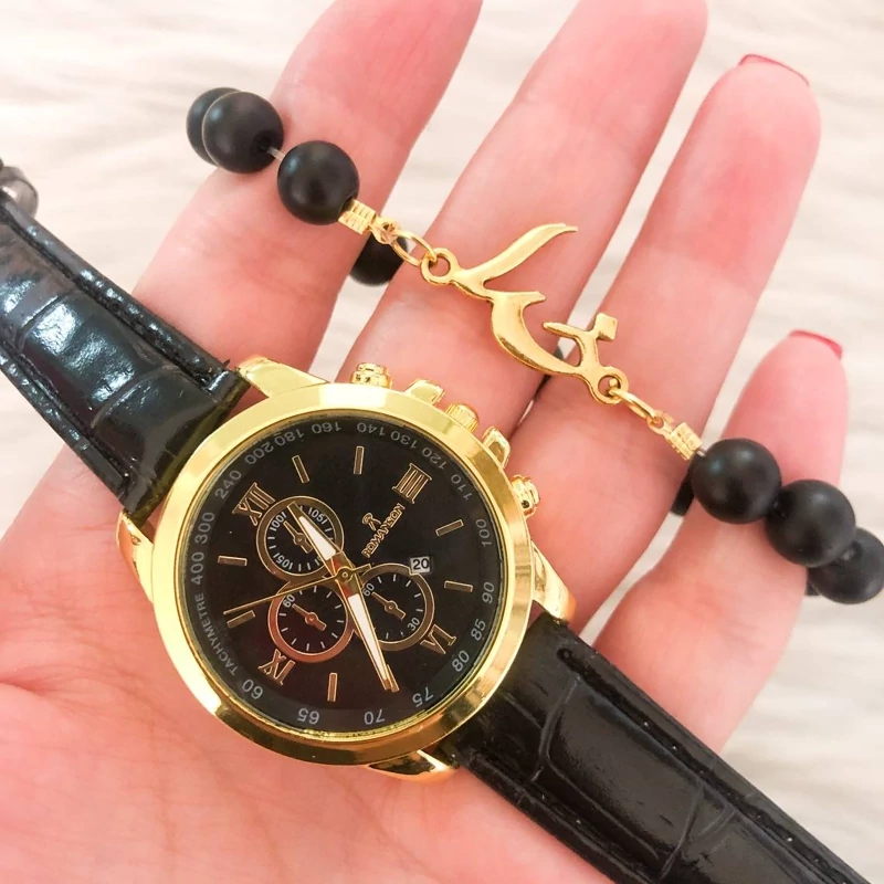 ساعت زنانه بند چرمی ست دستبند مهره سفید