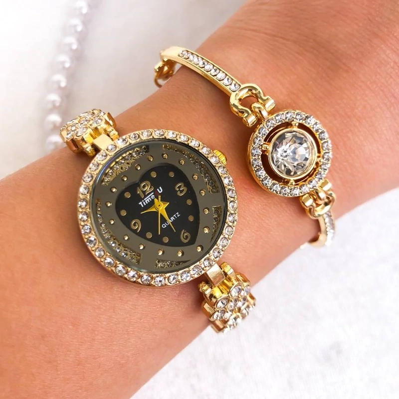 ساعت زنانه مجلسی طلایی طرح قلب بهمراه دستبند