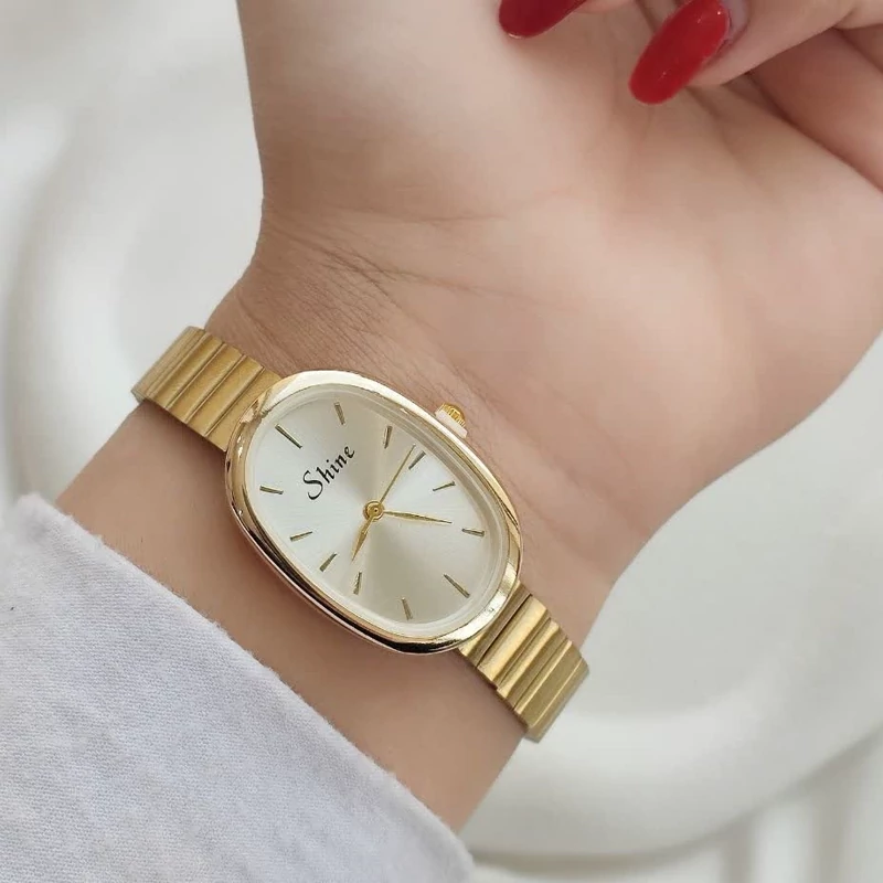ساعت زنانه طلایی بند ریلی صفحه بیضی