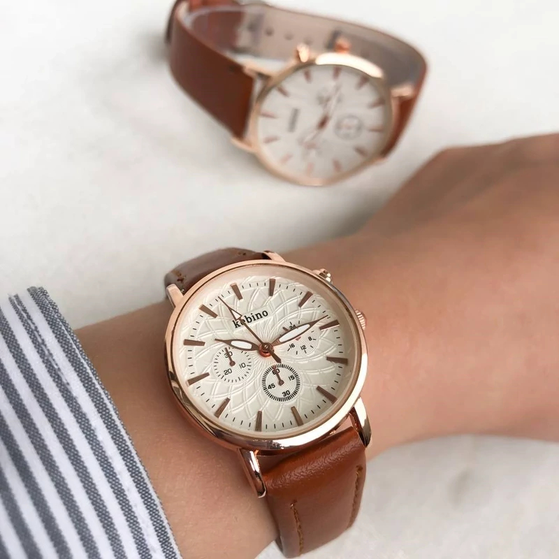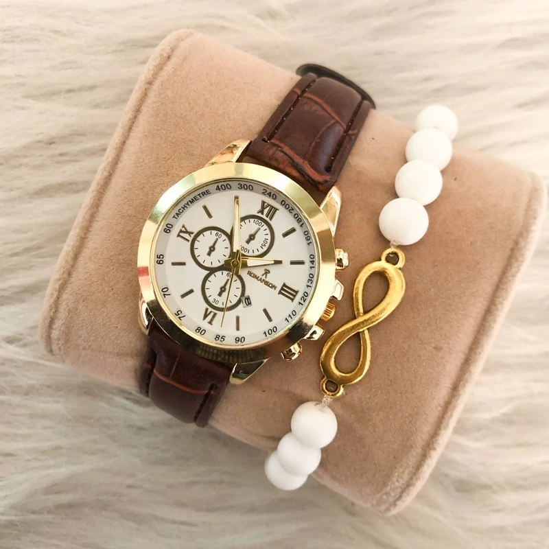 ست ساعت رومانسون بندچرم قهوه ای صفحه سفید. طرح سه موتوره