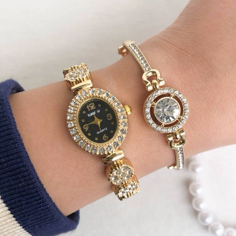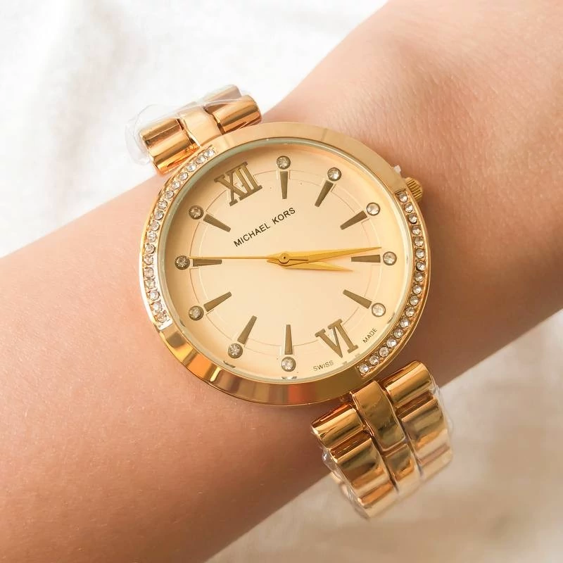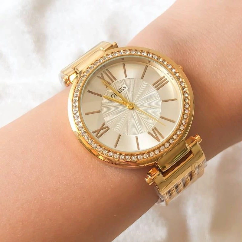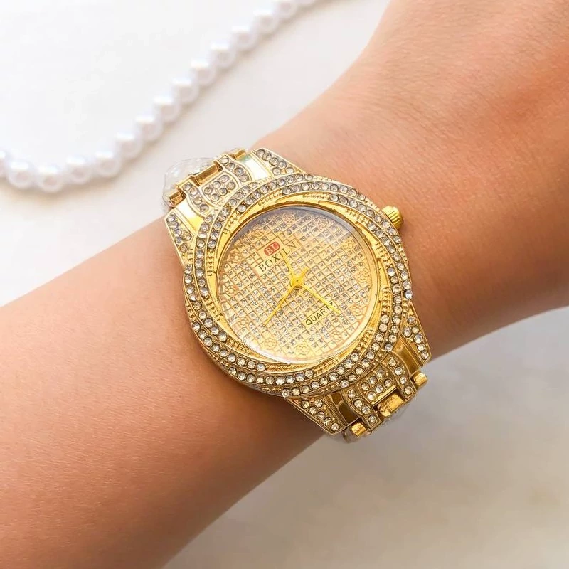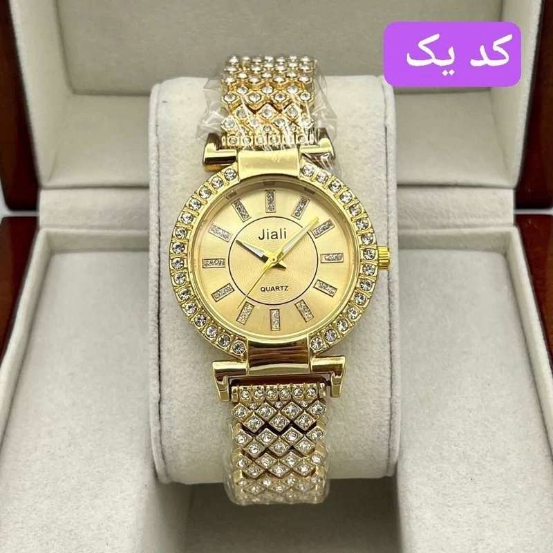 ساعت زنانه نگین دار طلایی بهمراه دستبند