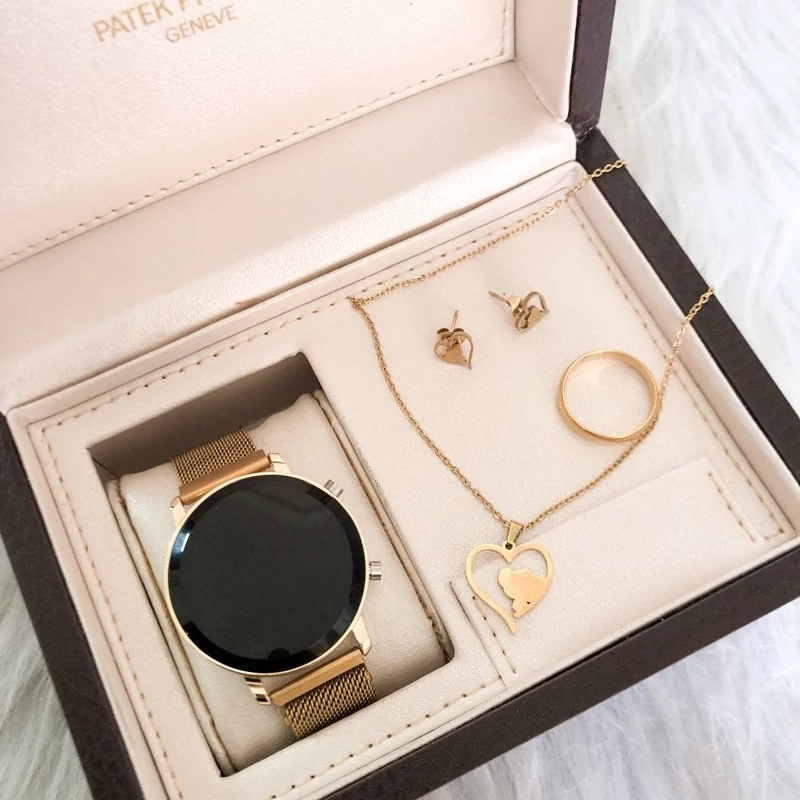 ست ساعت ال ای دی طلایی بند مگنتی لایت قرمز بهمراه نیم ست قلب و انگشتر مناسب هدیه ارسال رایگان