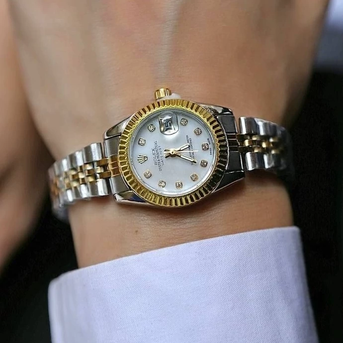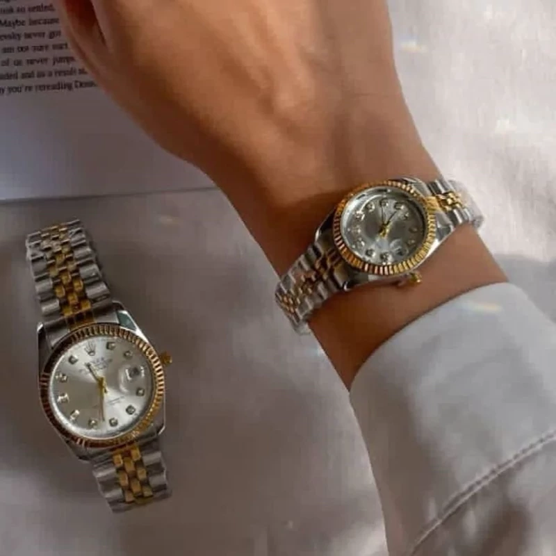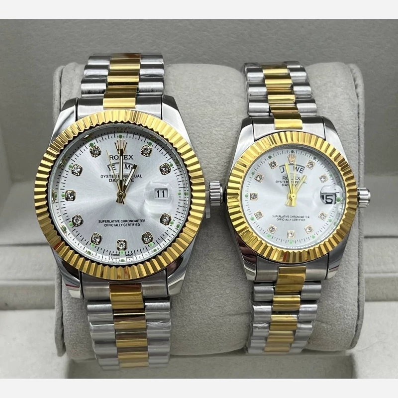 ست ساعت رولکس بند و قاب فول استیل دورنگ نقره ای طلایی صفحه سفید رنگ ثابت کیفیت درجه یک . تقویم دار