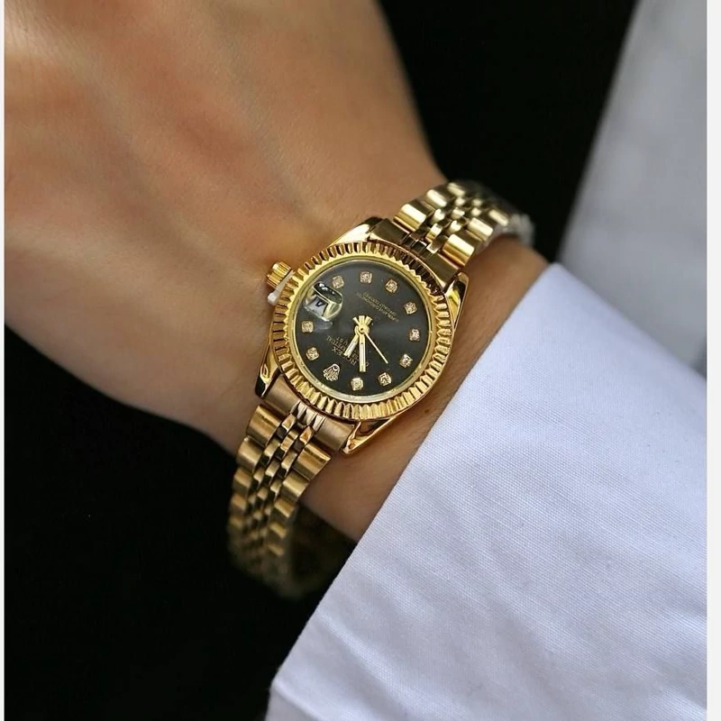 ساعت زنانه رولکس طلایی صفحه مشکی با گارانتی