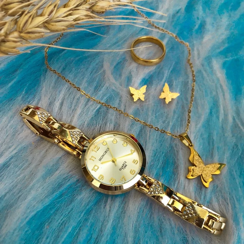 ست ساعت زنانه طلایی همراه با نیم ست و انگشتر طلایی