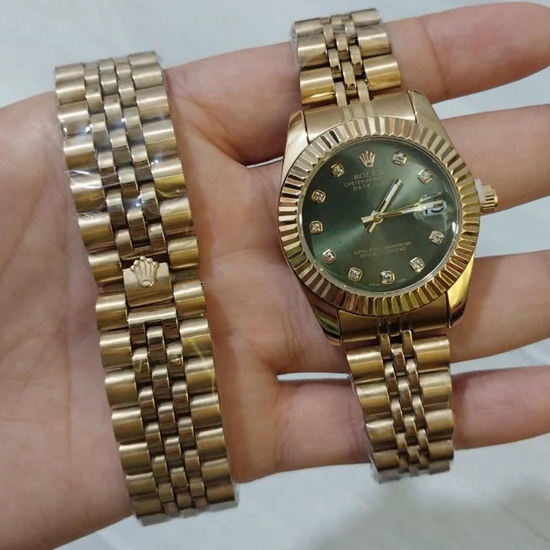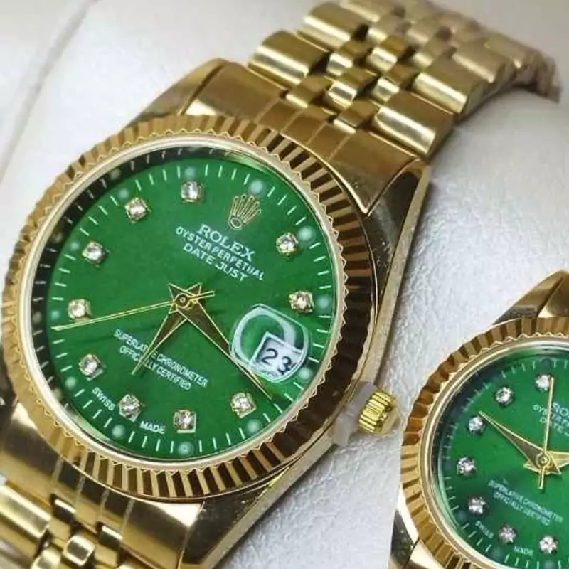 ساعت مردانه رولکس بند و قاب طلایی فول استیل صفحه سبز رنگ ثابت قفل اصلی با گارانتی 12 ماهه موتور