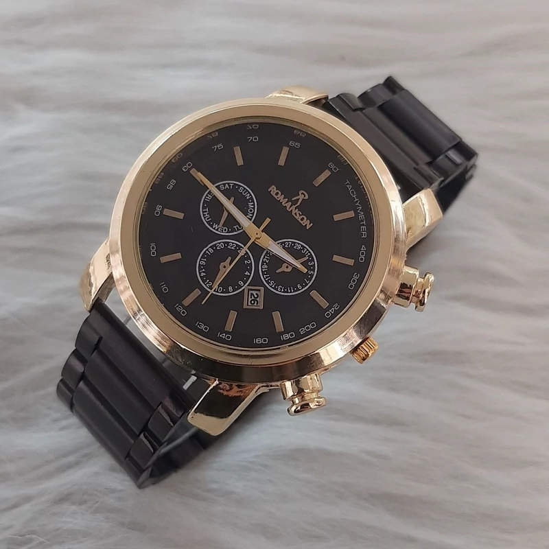 ساعت مردانه رومانسون مشکی صفحه مشکی قاب طلایی.