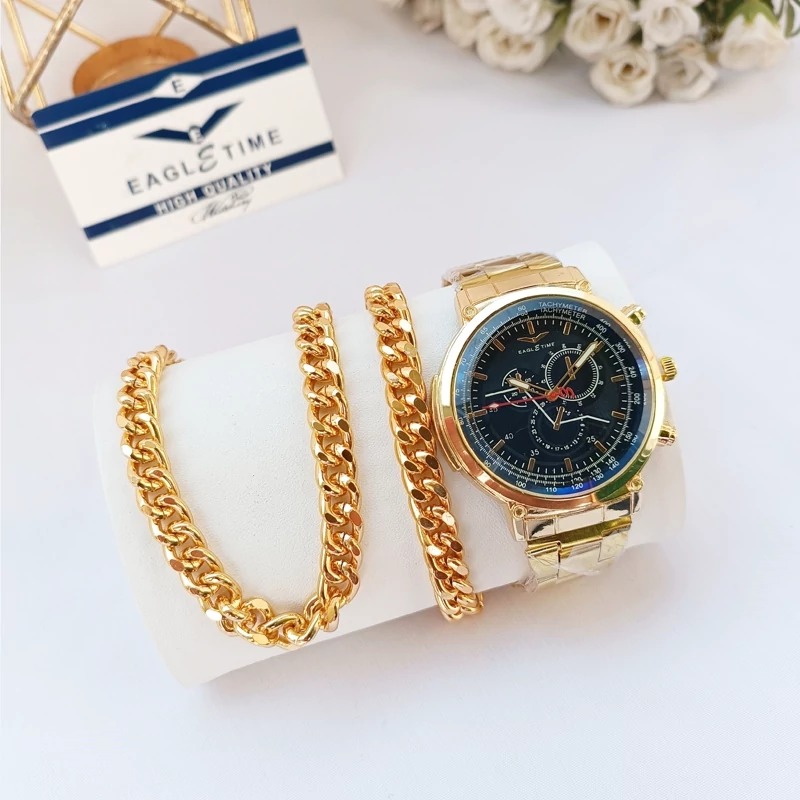 ساعت مچی مردانه طلایی دستبند گردنبند ست کامل
