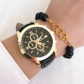ساعت زنانه سیتیزن بند چرم مشکی قاب طلایی ست دستبند مهره ای مشکی