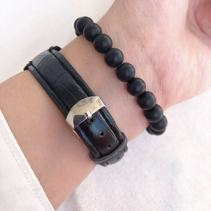 ساعت زنانه سیتیزن بند چرم مشکی قاب طلایی ست دستبند مهره ای مشکی