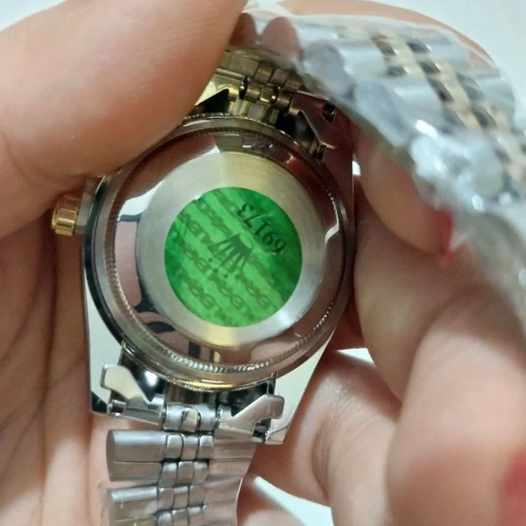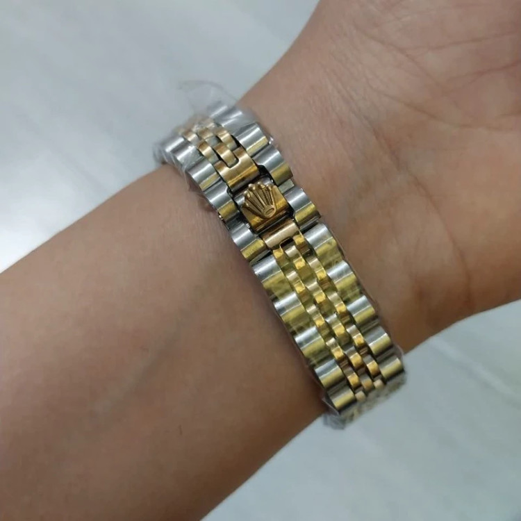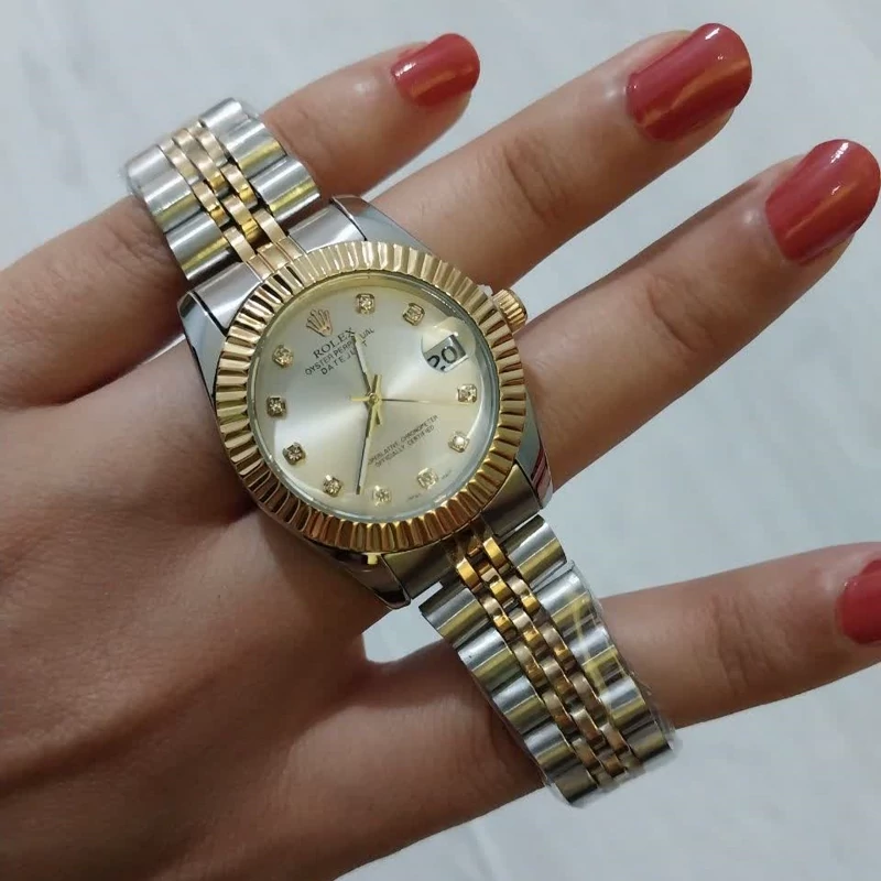 ساعت زنانه رولکس کیفیت درجه یک قفل اصلی حک آرم و تاج رولکس روی قفل و پیم و پشت قاب ساعت دارای تقویم ذره بینی