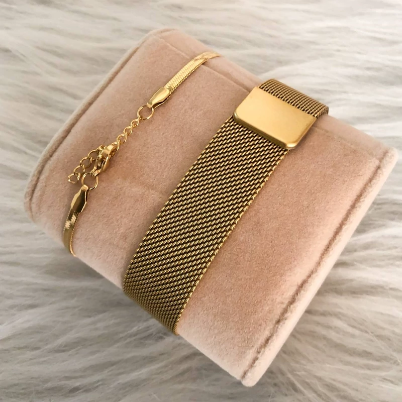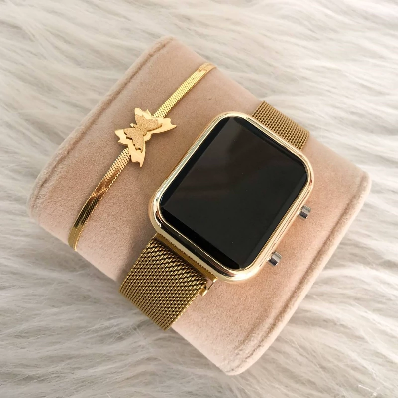 ست ساعت مگنتی ال ای دی طلایی مستطیلی دو کلید با کیفیت عالی وارداتی از دبی و دستبند پروانه طلایی رنگ ثابت دارای جعبه کادویی مخصوص ساعت