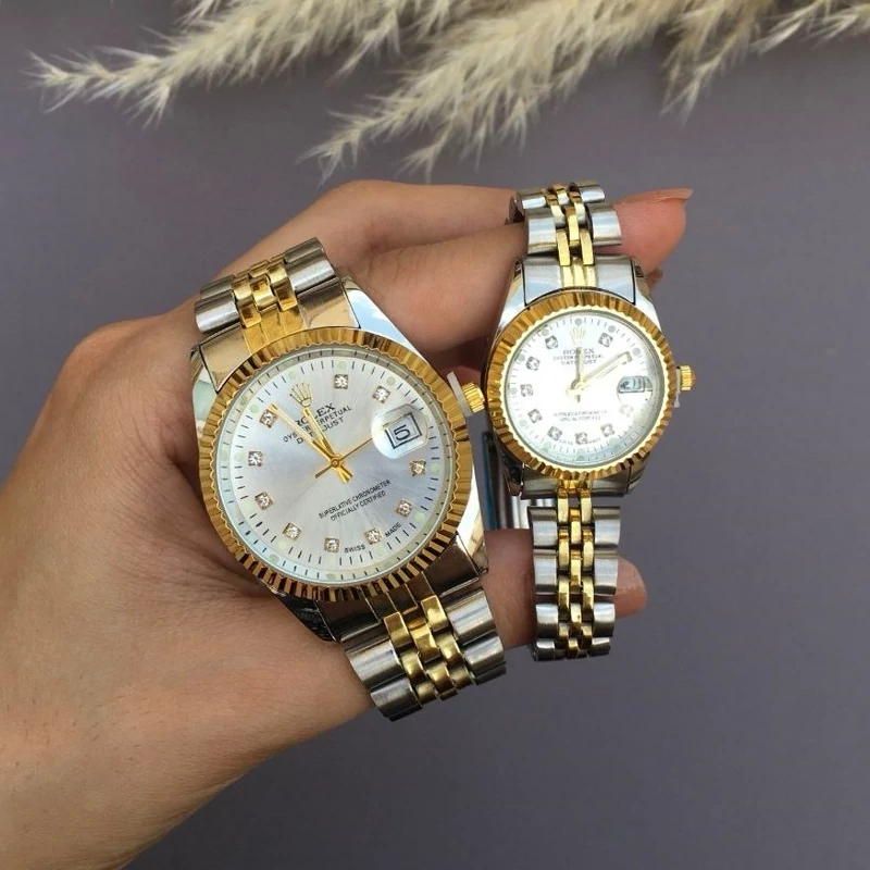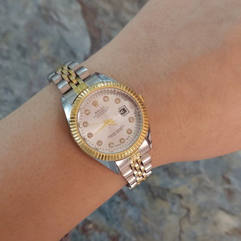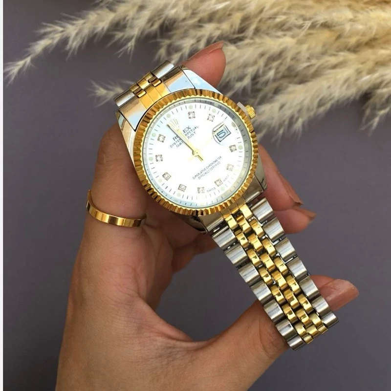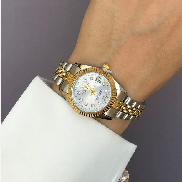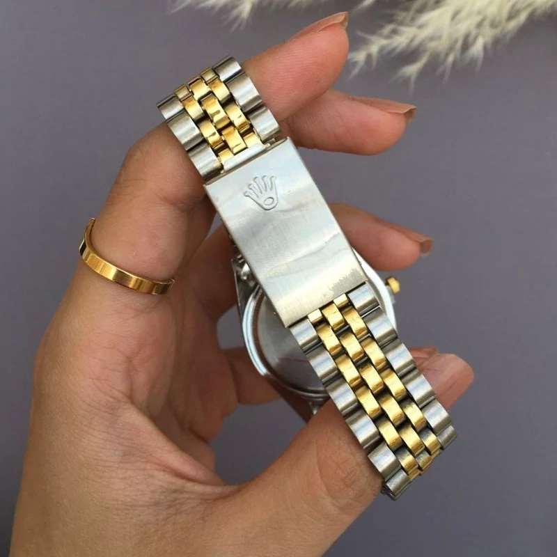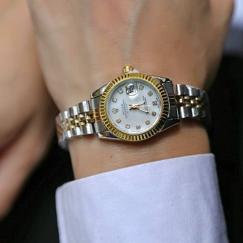 ساعت زنانه رولکس بنداستیل دورنگ صفحه سفید. شیشه ذره بینی کیفیت عالی. تقویم دار. شش ماه گارانتی موتور دارای جعبه کادویی مخصوص ساعت و کارت گارانتی