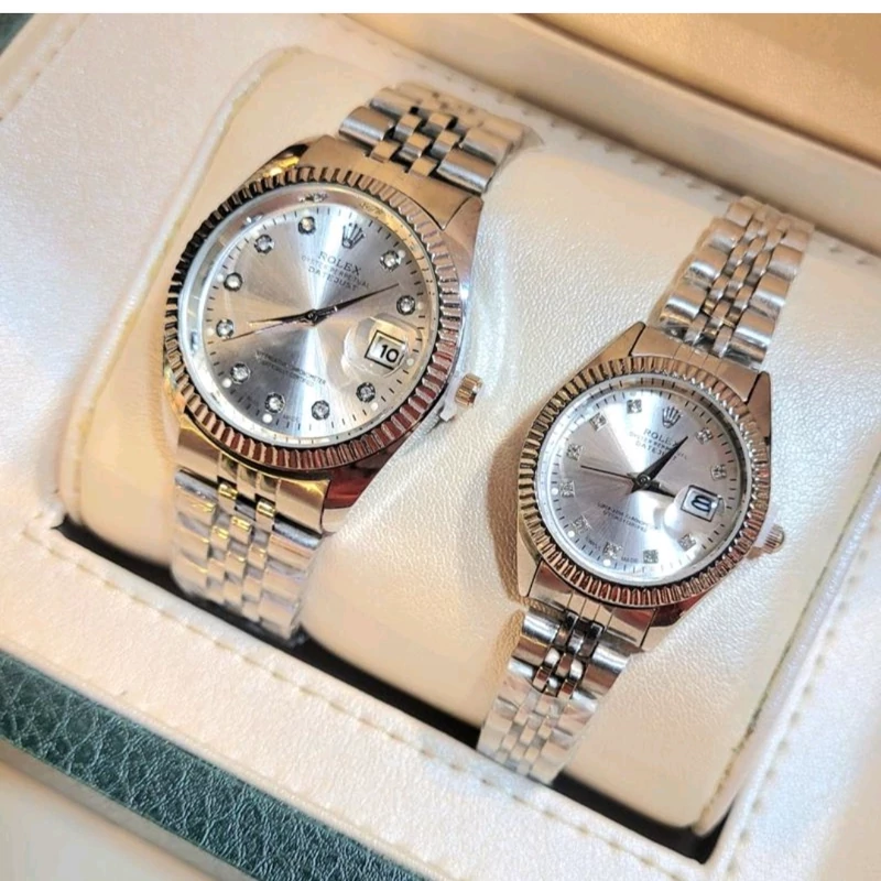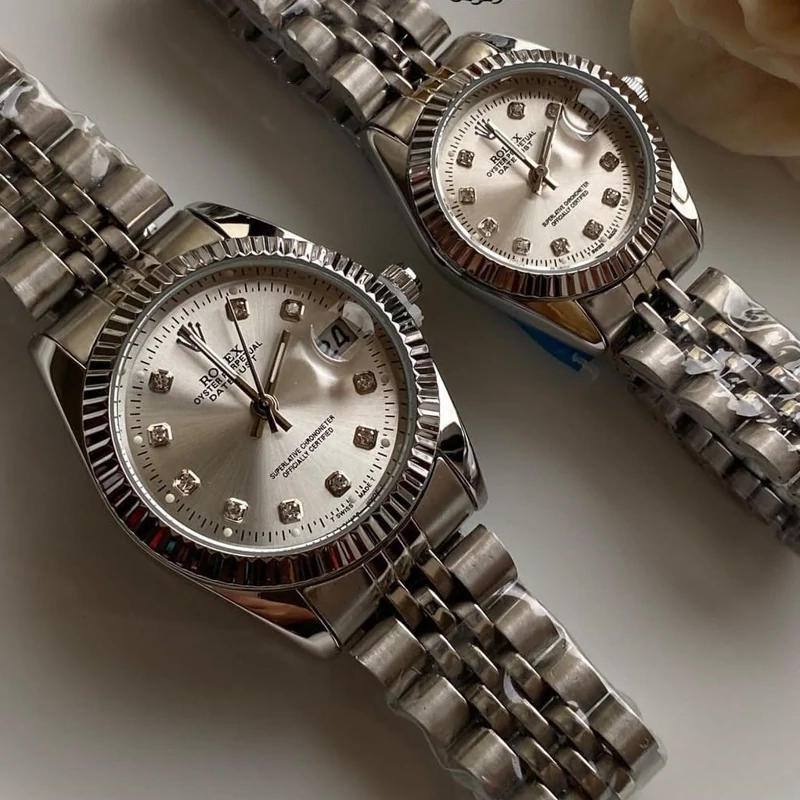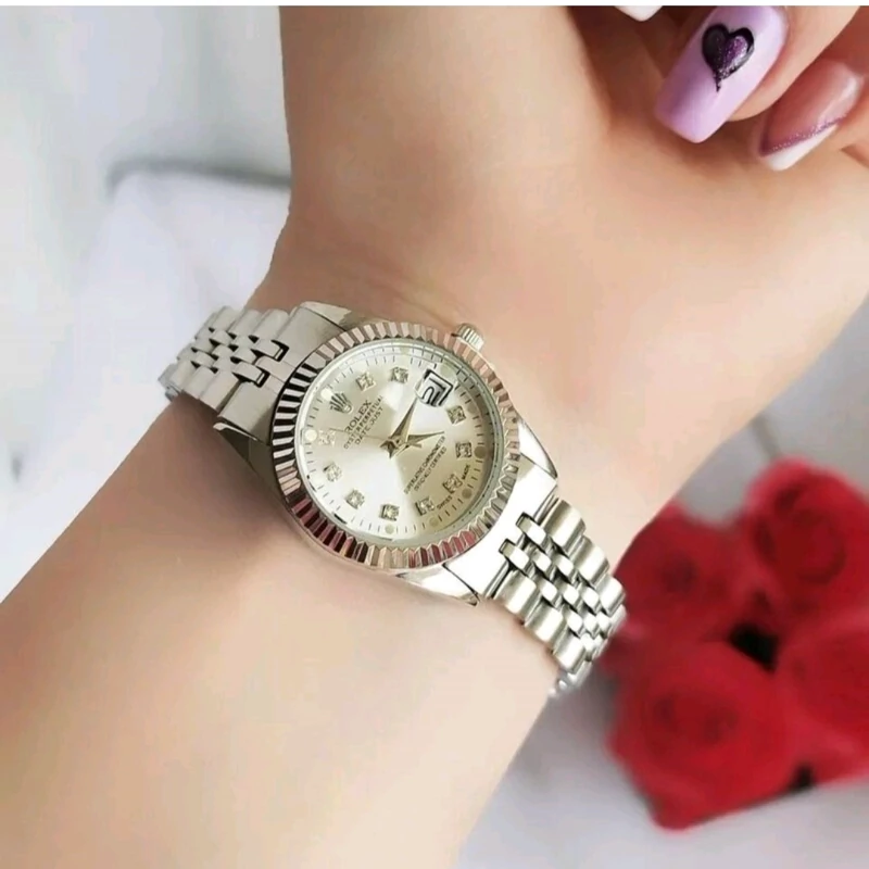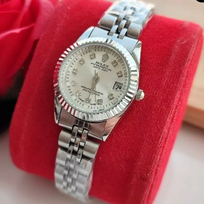 ساعت زنانه رولکس بند و قاب نقره ای صفحه سفید تقویم دار شیشه ذره بینی ۶ ماه گارانتی موتور ارسال رایگان بهمراه جعبه و کارت گارانتی موتور