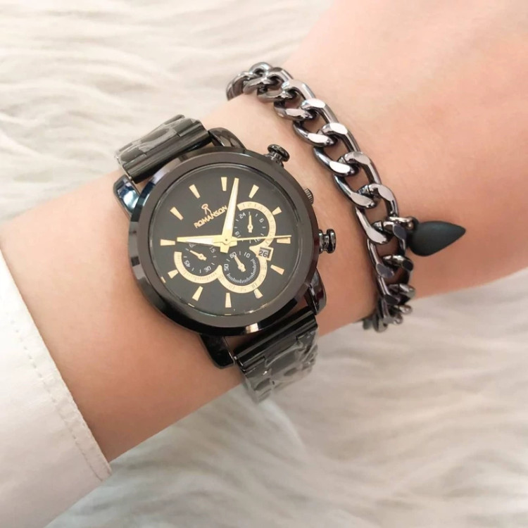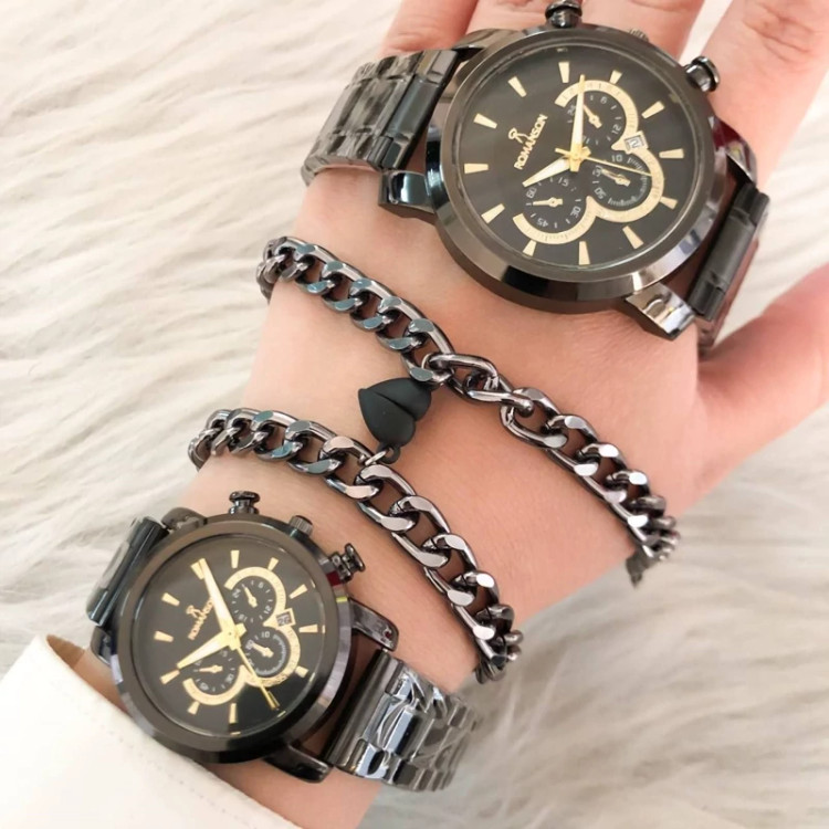 ست ساعت زنانه و مردانه مارک رومانسون بنداستیل مشکی صفحه مشکی. طرح سه موتوره