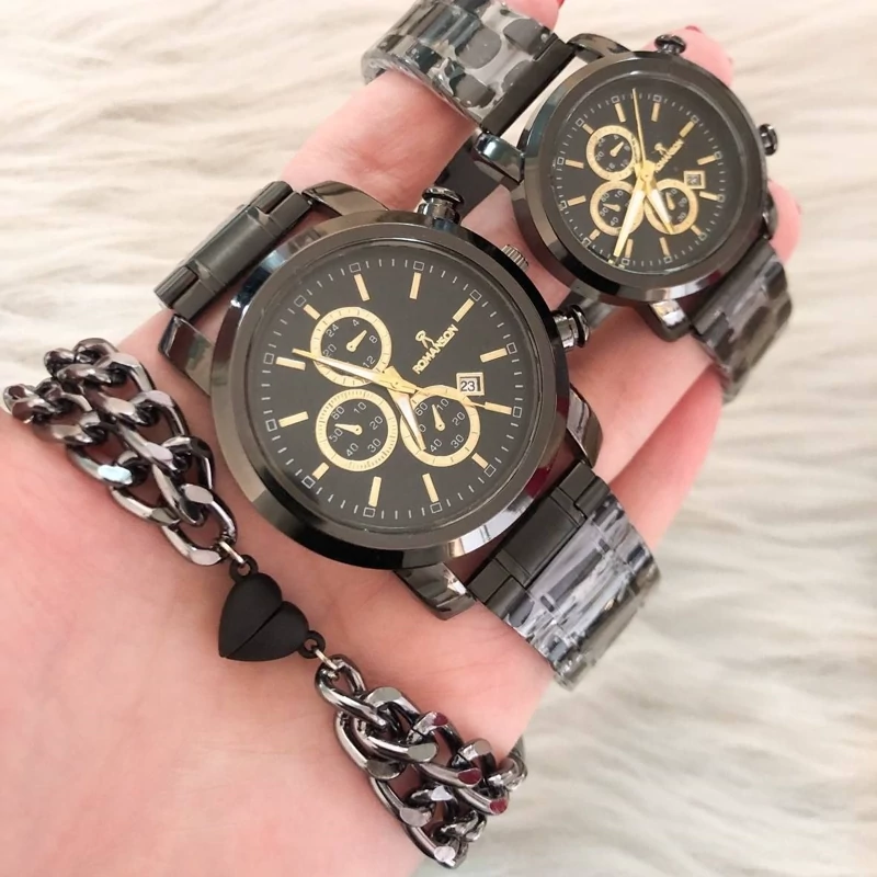 ست ساعت زنانه و مردانه مارک رومانسون بنداستیل مشکی صفحه مشکی. طرح سه موتوره