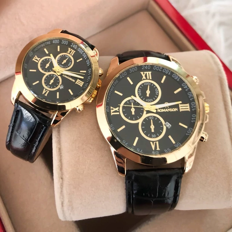 ست ساعت رومانسون بندچرم مشکی صفحه مشکی طرح سه موتوره