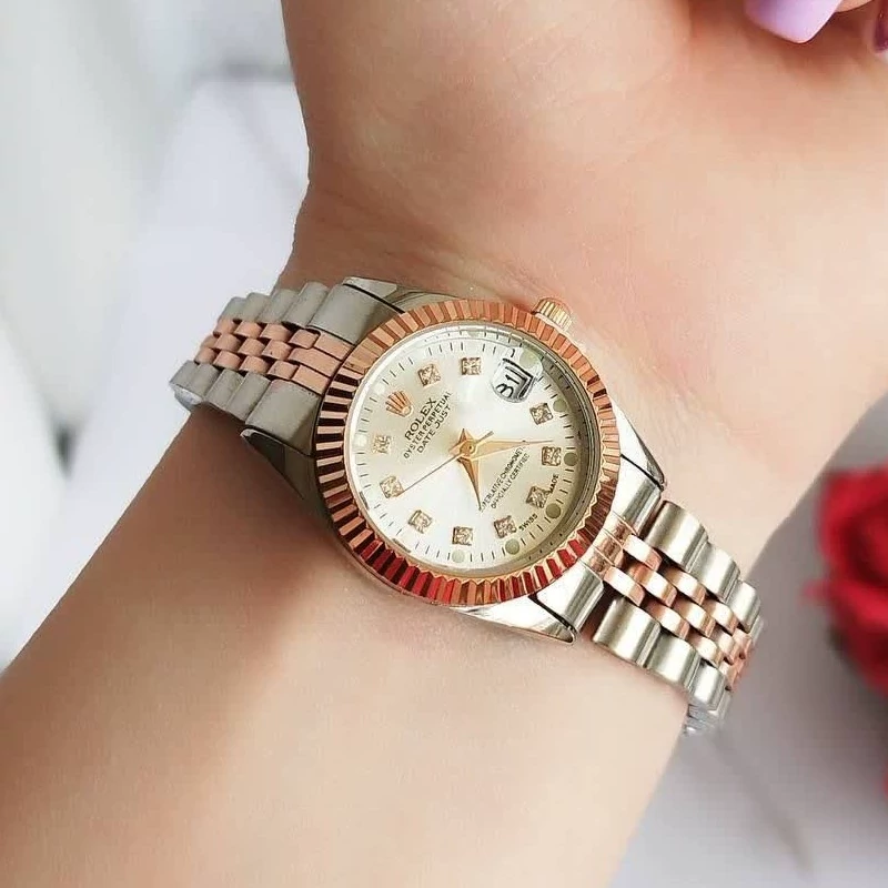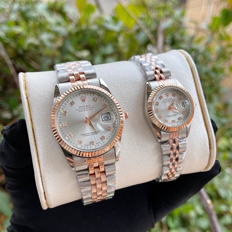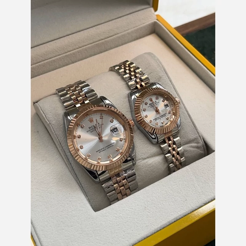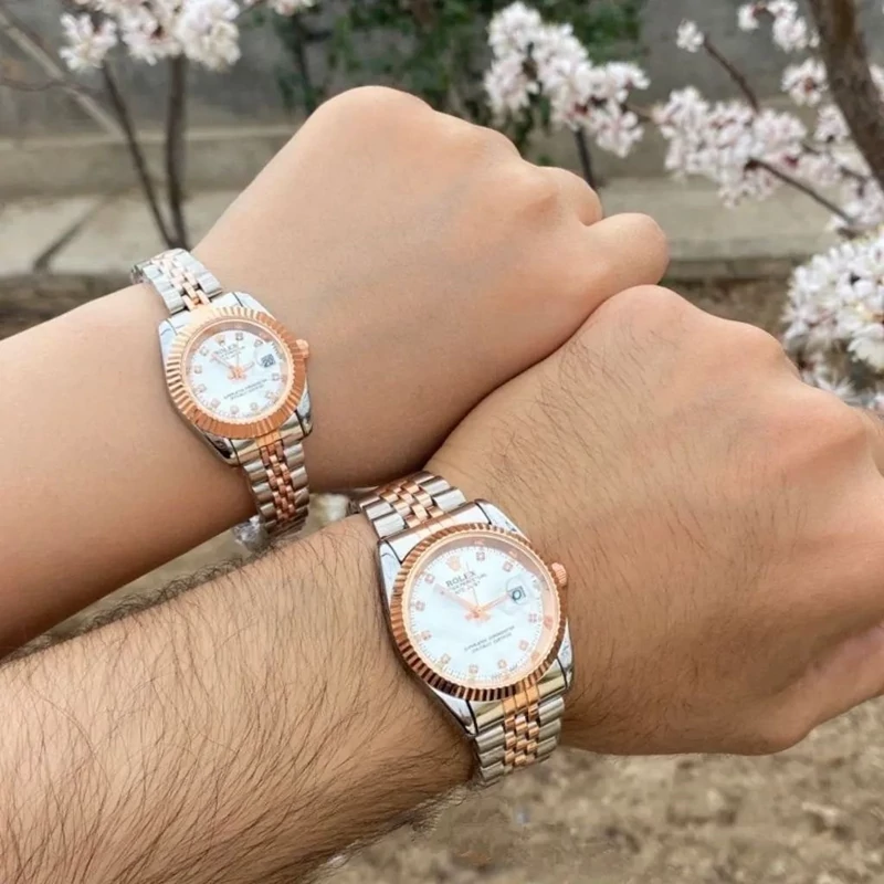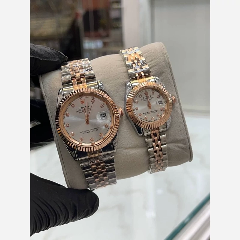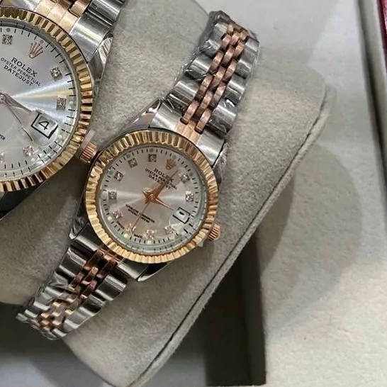 ساعت زنانه و مردانه رولکس بند و قاب دو رنگ نقره ای رزکلد صفحه سفید دارای تقویم ارسال رایگان بهمراه جعبه و کارت گارانتی ۶ ماهه موتور فروش ب صورت ست و تک