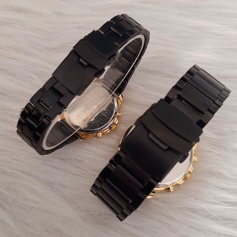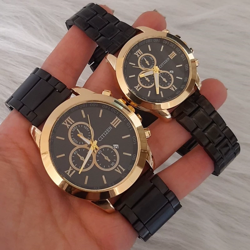 ست ساعت زنانه و مردانه مارک سیتیزن بنداستیل مشکی صفحه مشکی قاب طلایی. طرح سه موتوره