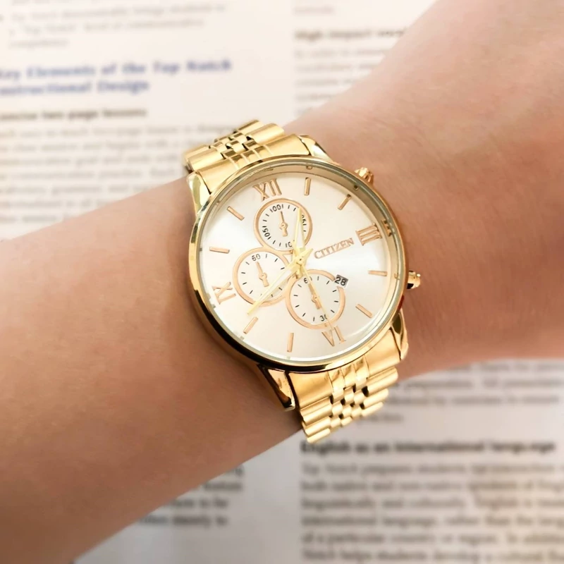 ساعت مردانه مارک سیتیزن بند و قاب طلایی صفحه سفید طرح 3 موتوره تقویم دار کیفیت عالی شش ماه گارانتی موتور دارای جعبه کادویی