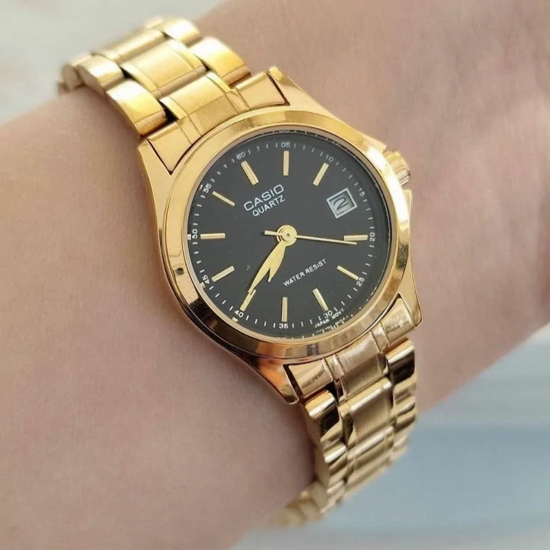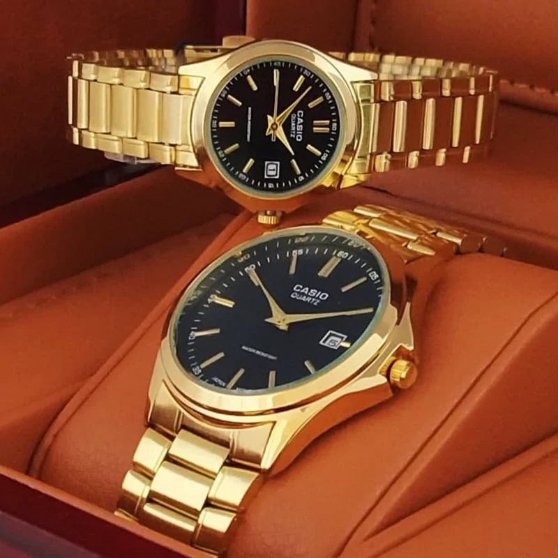 ساعت کاسیو مردانه بند و قاب طلایی صفحه مشکی کیفیت درجه یک ۶ ماه گارانتی موتور فروش بصورت ست و تک