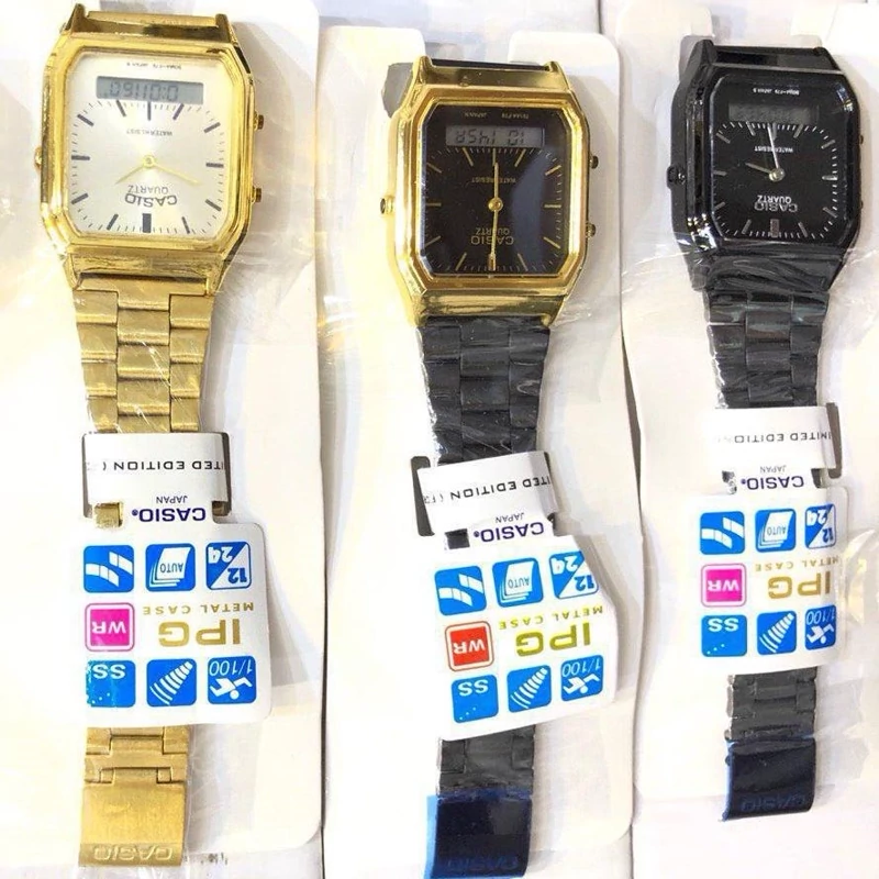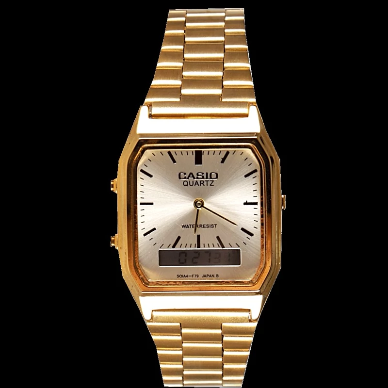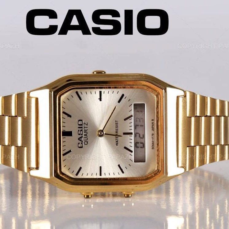 ساعت مچی مردانه کاسیو دو زمانه دیجیتال و آنالوگ ارسال رایگان بهمراه جعبه ۶ ماه گارانتی موتور بند طلایی صفحه مشکی موجوده