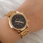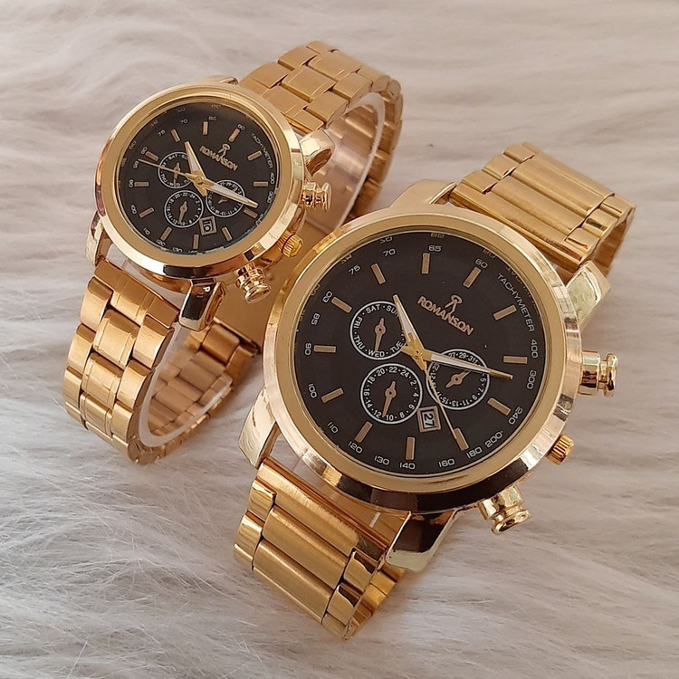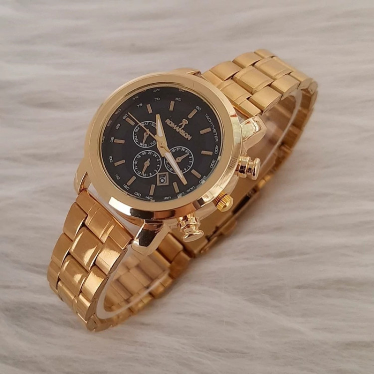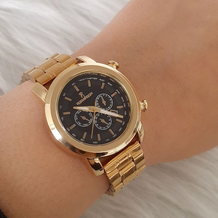 ساعت زنانه مارک رومانسون بنداستیل طلایی صفحه مشکی قاب طلایی. طرح سه موتوره