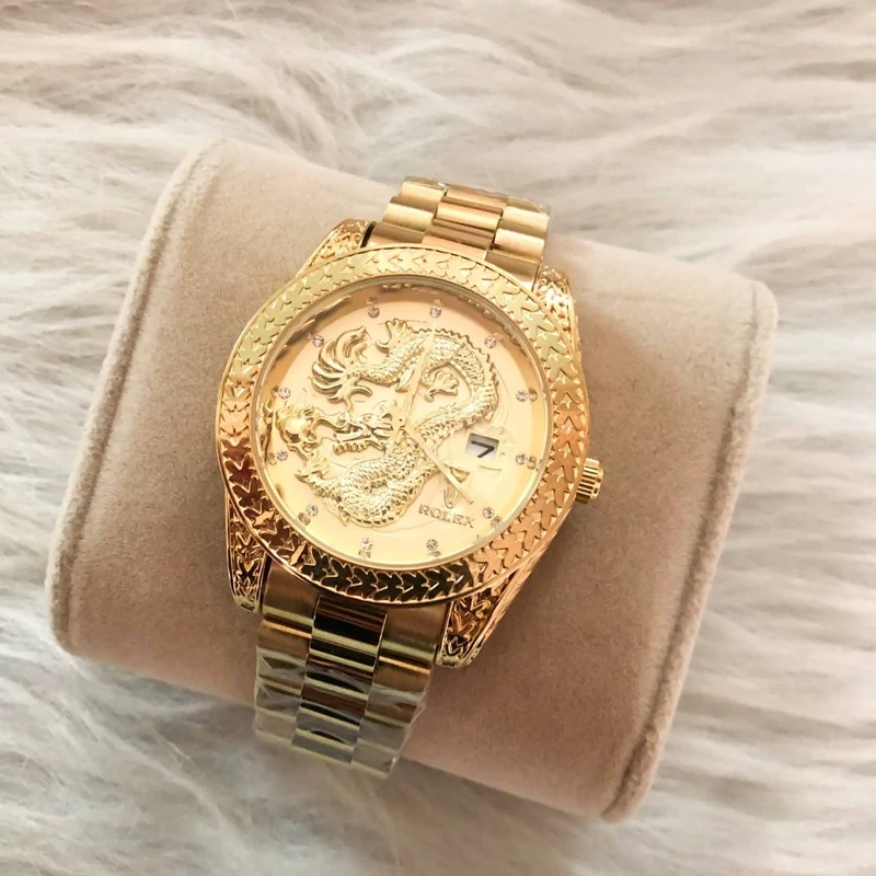ساعت مردانه رولکس طرح دراگون دارای تقویم کیفیت عالی بنداستیل طلایی صفحه طلایی