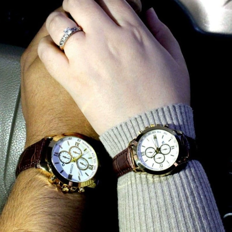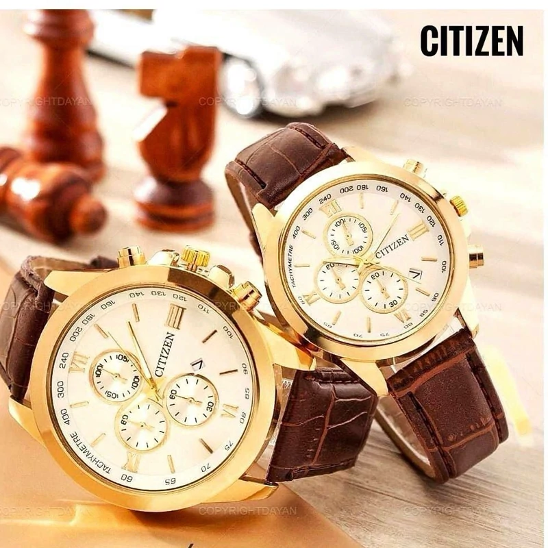 ساعت سیتیزن زنانه و مردانه قاب طلایی صفحه سفید دارای تقویم تک موتوره طرح س موتوره (ثبات رنگ بالا) 6 ماه ضمانت موتور ارسال رایگان بهمراه جعبه و کارت گارانتی کیفیت عالی فروش ب صورت ست و تک