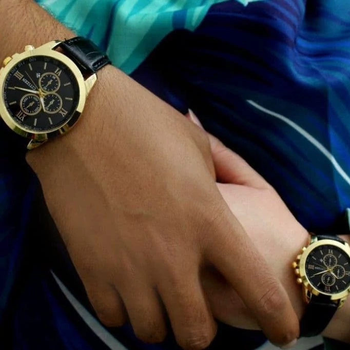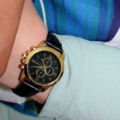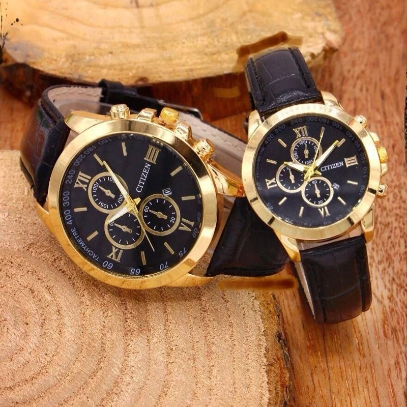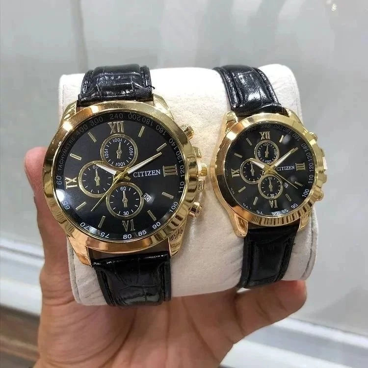 ست ساعت سیتیزن بندچرمی مشکی صفحه مشکی طرح سه موتوره. دارای تقویم کیفیت عالی 6 ماه گارانتی موتور بهمراه جعبه