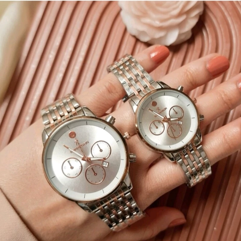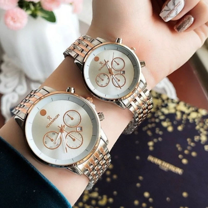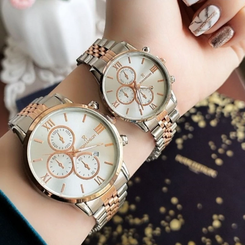 ساعت زنانه رومانسون طرح ۳ موتوره ثبات رنگ بالا بند دو رنگ نقره ای رزگلد دارای تقویم ارسال رایگان بهمراه جعبه و کارت گارانتی موتور