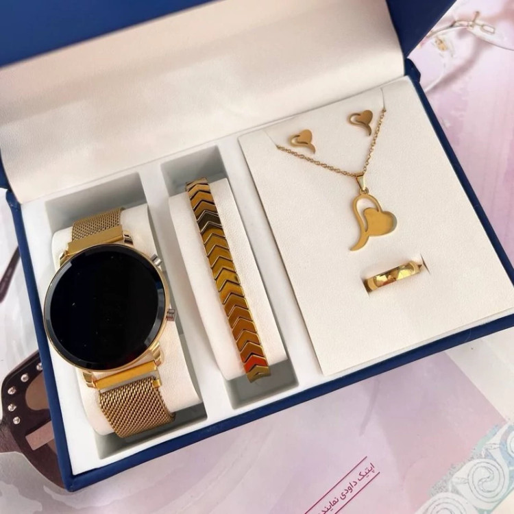 پک ساعت ال ای دی مگنتی و نیم ست و دستبند طلایی همراه با حلقه