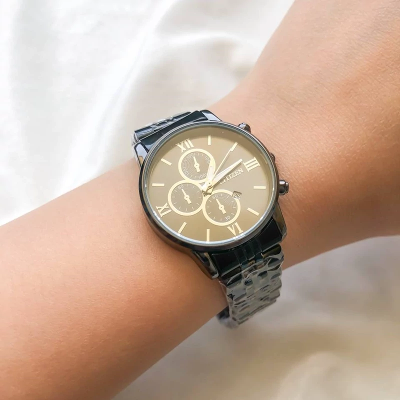 ست ساعت سیتیزن فول مشکی تک موتوره طرح 3 موتوره دارای تقویم و کارت گارانتی شش ماه ضمانت موتور. دارای جعبه، بهمرآه دستبند کارتیر مشکی
