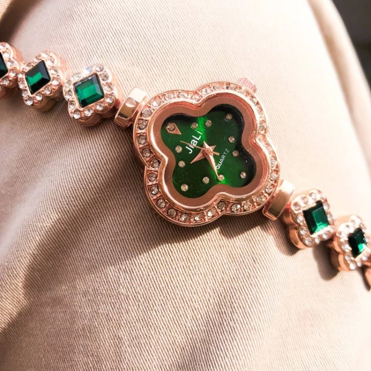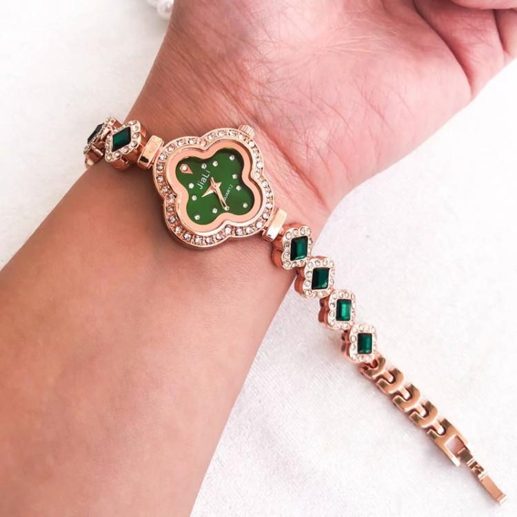 ساعت زنانه فانتزی ظریف قطر صفحه 20 میل رزگلد بند نگین سبز و سفید