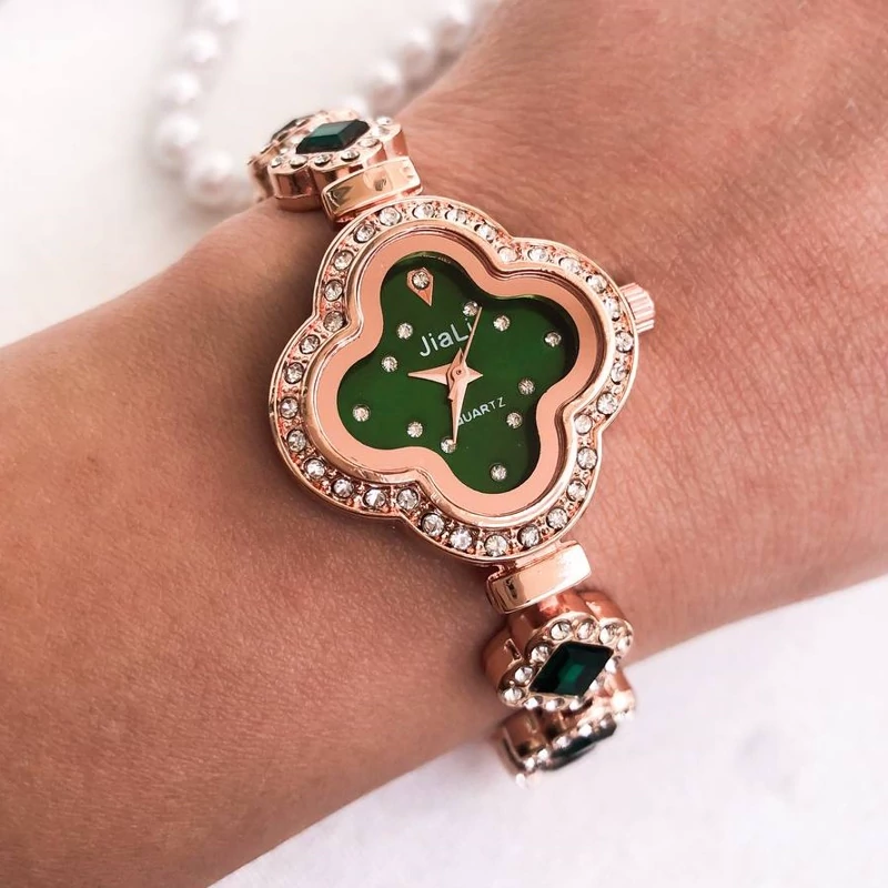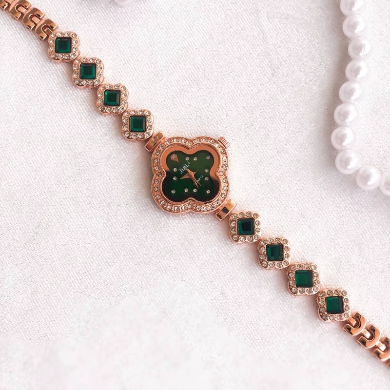 ساعت زنانه فانتزی ظریف قطر صفحه 20 میل رزگلد بند نگین سبز و سفید