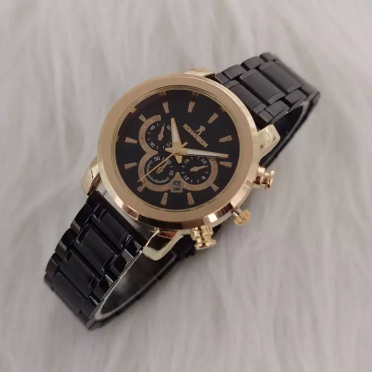 ساعت زنانه مارک رومانسون بنداستیل مشکی صفحه مشکی قاب طلایی. طرح سه موتوره