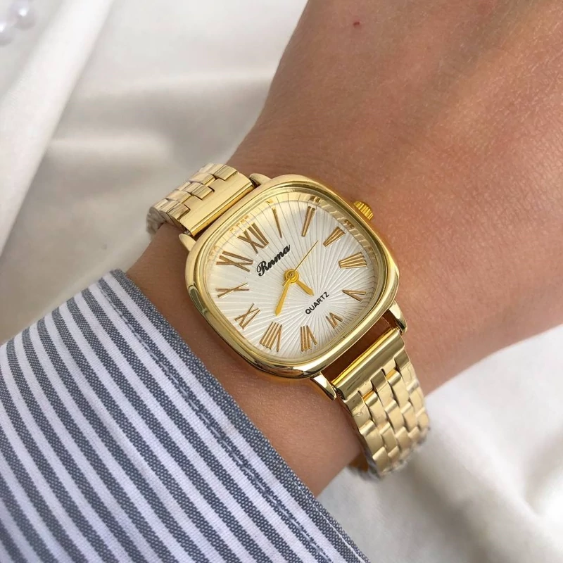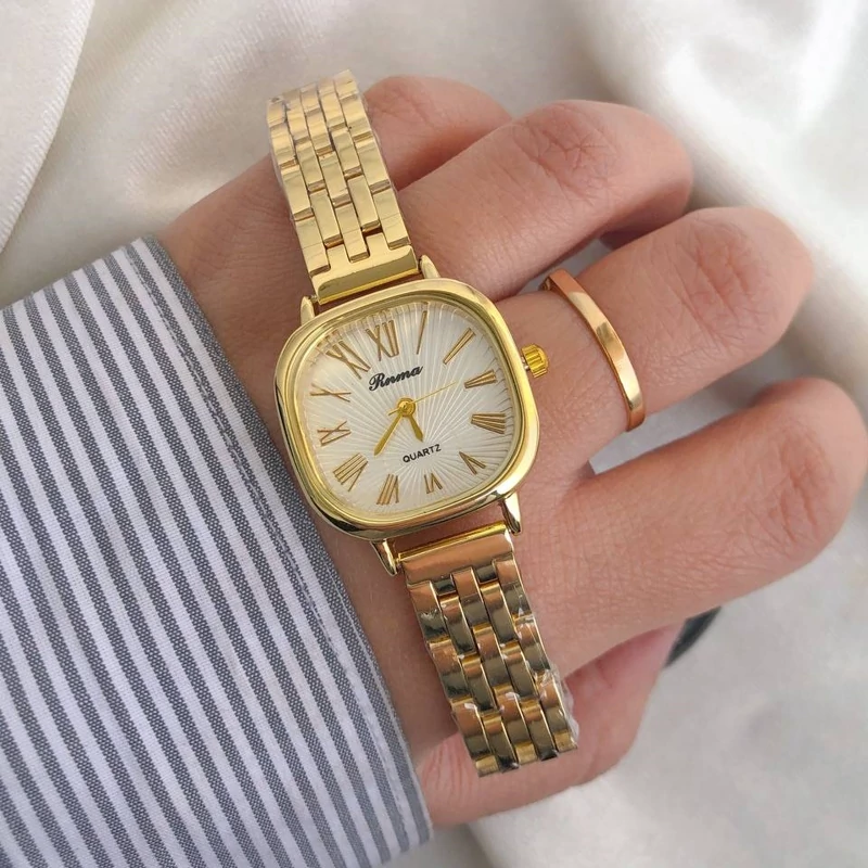 ساعت زنانه صفحه مربعی بند و قاب طلایی صفحه سفید 6 ماه گارانتی موتور ارسال رایگان بهمراه جعبه و گارانتی موتور