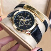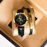 ساعت زنانه بند چرم مشکی قاب طلایی صفحه مشکی بهمراه دستبند چرم مشکی