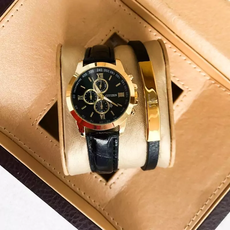 ساعت زنانه سیتیزن قاب طلایی صفحه مشکی بندچرم مشکی بهمراه دستبند مشکی قاب طلایی