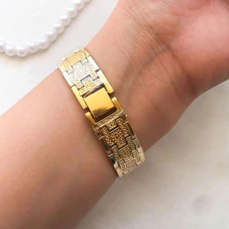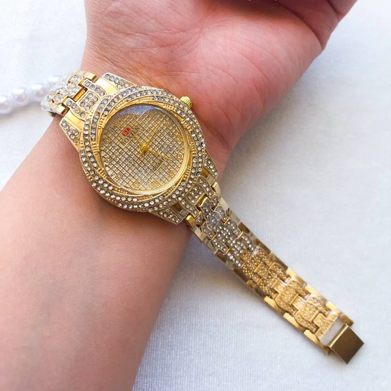 ساعت زنانه مجلسی طلایی نگین یفید کیفیت عالی قطر صفحه 27 میل شش ماه گارانتی موتور دارای جعبه کادویی