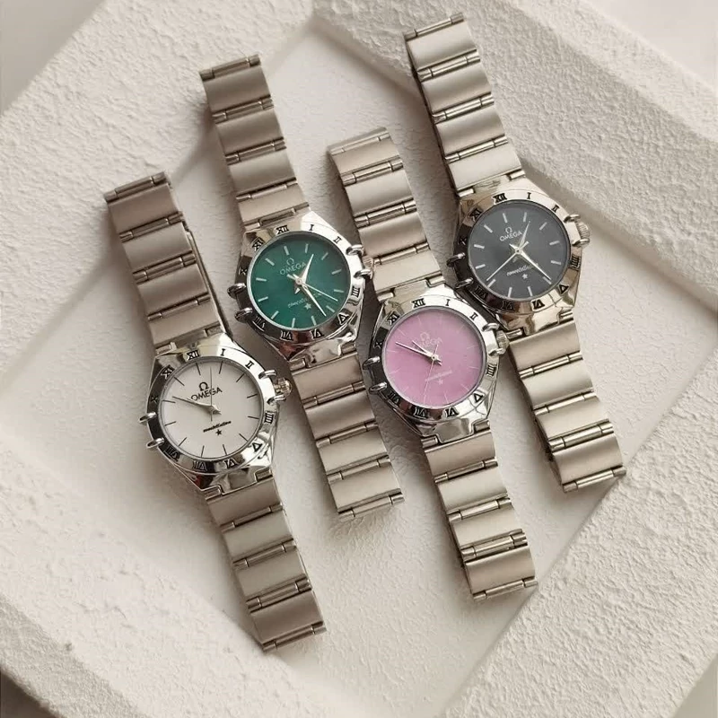 ساعت زنانه مارک امگا بند و قاب نقره ای صفحه مشکی رنگبندی صفحه متنوع 6 ماه گارانتی موتور ارسال رایگان بهمراه جعبه و کارت گارانتی موتور