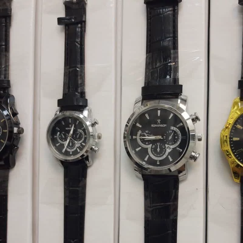 ساعت زنانه رومانسون قاب نقره ای بند چرم مشکی صفحه مشکی 6 ماه گارانتی موتور دارای تقویم ارسال رایگان بهمراه جعبه و کارت گارانتی موتور فروش بصورت ست و تک