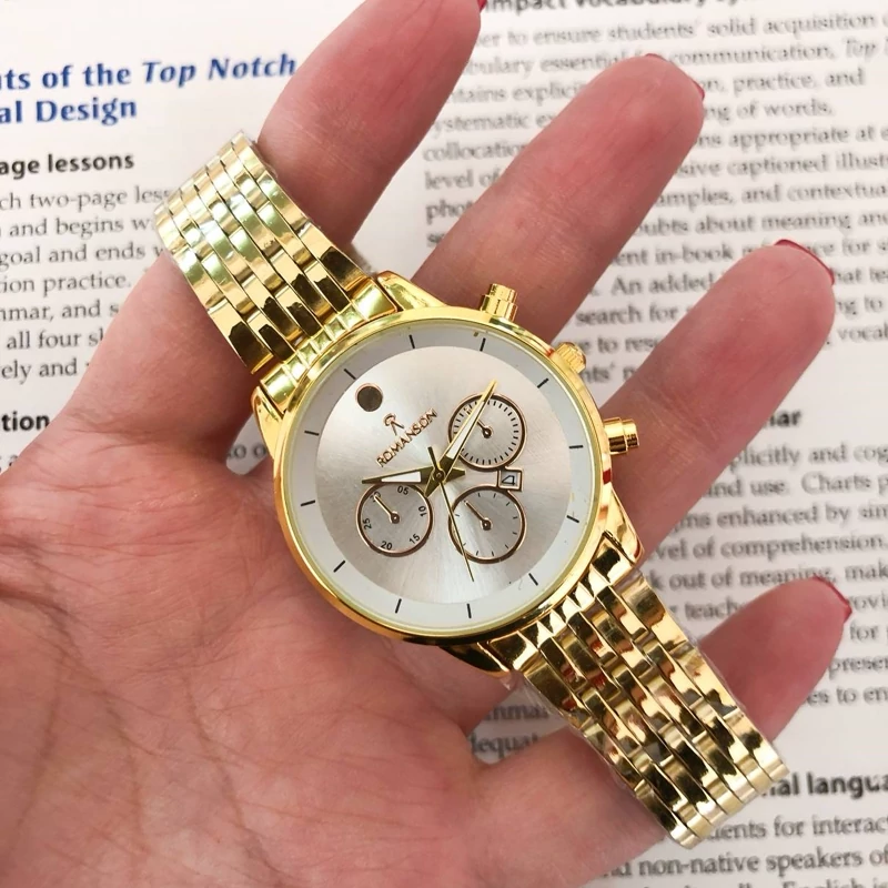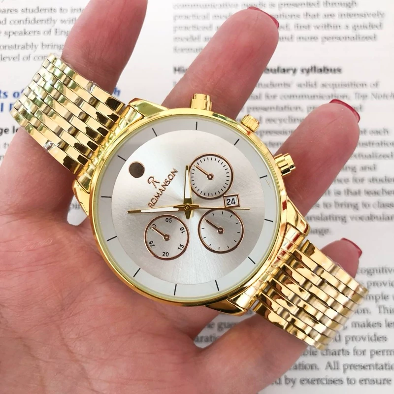 ست ساعت رومانسون بنداستیل طلایی صفحه سفید دارای تقویم دار تکموتوره طرح سه موتوره کیفیت عالی شش ماه گارانتی موتور دارای جعبه کادویی مخصوص ساعت و کارت گارانتی قطر شیشه ساعت مردانه حدود 38 میلیمتر قطر شیشه ساعت زنانه حدودا 30 میلیمتر